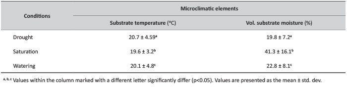 According to the results in Table 6, significant differences were found in mean values of substrate temperature and volumetric substrate moisture for the observed cases of drought, saturation and normal watering.