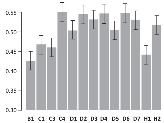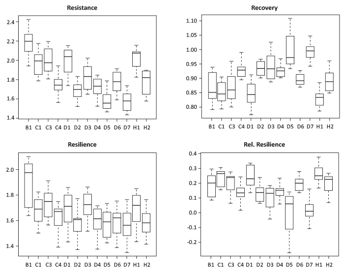 Seasonal variations of FAPAR can be applied in a more suitable way to obtain more perceptive insight into the adaptive capacity of beech ecosystems by calculating resilience metrics (resistance, recovery, resilience and relative resilience). Resilience metrics provide a quantitative insight into the intrinsic capacity and responses of beech ecosystems to climate alterations (Fig. 12). The highest resistance is distinctive for ecosystem B1 followed by the group of ecosystems C1, C3, H1 and D1. On the contrary, ecosystems inside bioclimate D (except D1) exhibit the lowest resistance. Recovery, as an inverse of resistance (ecosystems with a smaller drop of FAPAR also have lower recovery), show a relatively opposite picture with pronounced ecosystems D5 and D7. Consequently, the ecosystem with the highest resilience is ecosystem B1, followed by the group of ecosystems inside bioclimate C together with D1, D3 and H1. The lowest resilience was shown in ecosystems inside bioclimatic group D. With respect to relative resilience, ecosystems exhibit a very heterogenic image where only ecosystems D5 and D7 deviate more from others.