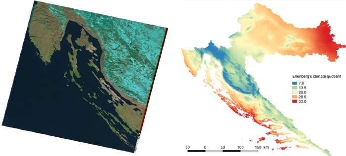 FIGURE 4. Snow boundary indicating the limits of the common beech distribution in Mediterranean (left), spatial coverage of Ellenberg’s climate quotient (right)