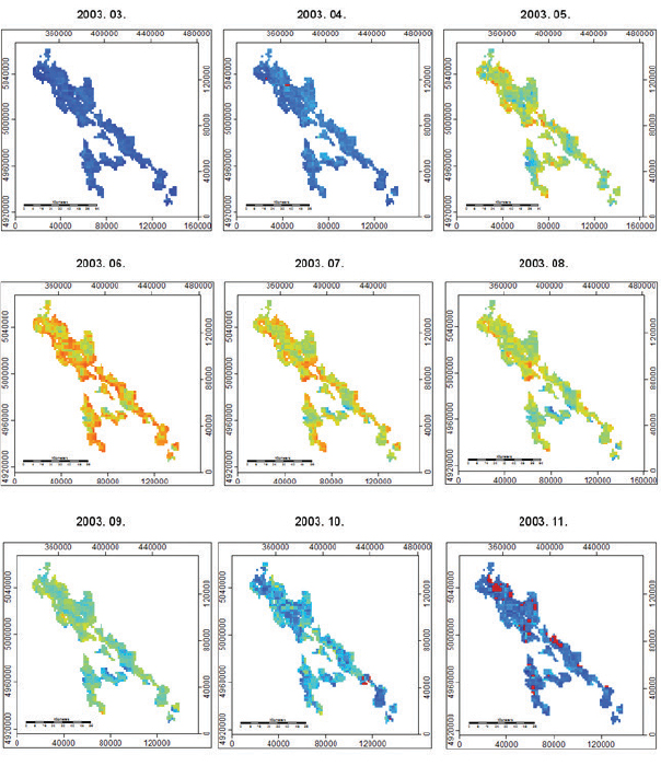 Freely available, monthly FAPAR (Fraction of Absorbed Photosinthetically Active Radiation) data [19] was obtained from the JRC FAPAR website (http://fapar.jrc.ec.europa.eu). Data was acquired in monthly intervals for the period from 1998 to 2005. Basic manipulation and transformation of the data in a suitable format for SAGA GIS spatial analysis was performed by BEAM VISAT software. Monthly FAPAR images, 96 in total from 1998-2005, were then clipped with the 13 area shape files that represent envelopes of beech ecosystems. Associated FAPAR pixels (with a 1 km spatial resolution) were extracted (Figure 5). However, so as to eliminate the problem of the false high FAPAR intensity (the appearance of extreme FAPAR values during the winter season, very possibly as a reflection of snow cover), only months in seasons with certain vegetation activity (from March to November) were used for analysis. Average monthly FAPAR values for each of the 13 area samples, from March to November within the eight year period, were calculated from related pixels using “Spatial and geostatistic analysis module” in SAGA GIS. Further data processing, statistics and graphical representation were performed in R software for statistical computing.