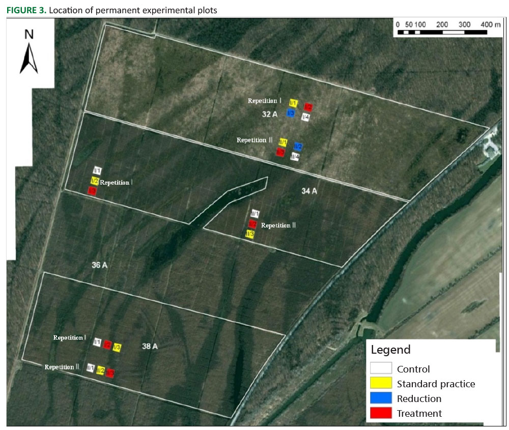 In each subcompartment two repetitions composed of three experimental plots called “Standard practice”, “Treatment” and “Control” were set up, with the exception of subcompartment 32A in which an additional plot called “Reduction” was set up as well.