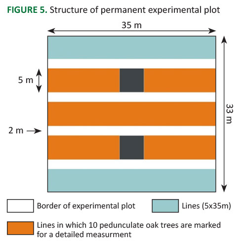 After the establishment and marking of permanent experimental plots, the selection of future trees and the conducted cleaning, measurements were carried out. The measurements were carried out in the spring of 2011. On each of the three inner lines two cross-sectional diameters at breast height, trunk length (height of the beginning of the crown), the height of the widest part of the crown, two crown radius and the total height of the tree were measured on marked pedunculate oak trees.