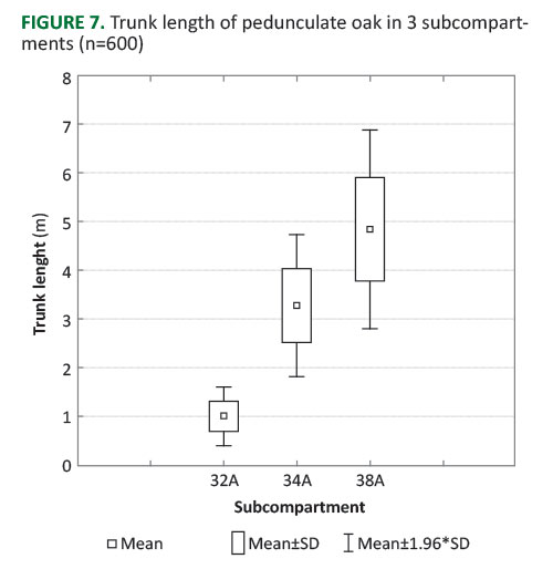 Figure 7 represents a box-and-whisker chart. Based on this figure, while taking into account the subcompartment age, it can be concluded that trunk length, i.e. trunk purity increases with age; in subcompartment 32A its average value is 1.35 m, in 34A 3.28 m and in 38A 4.85 m.