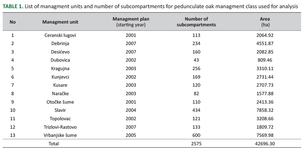 The process of creating surface structure projection area started with the analysis of data from the management plan. Based on the management plan data 13 management units with predominant pedunculate oak management class were selected, covering the area of Spačva Forest managed by Forest Administration Vinkovci (Table 1), and were then used for further analyses.