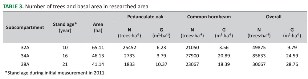 TABLE 3. Number of trees and basal area in researched area.