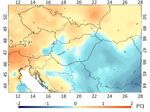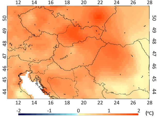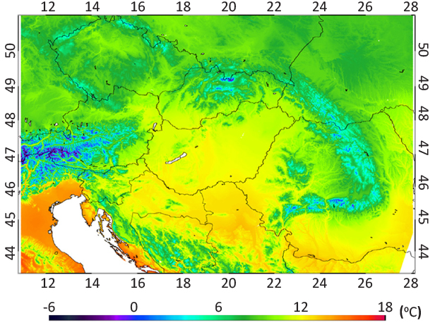 Mean temperature and precipitation fields (respectively) calculated for the entire domain area of the FORESEE database are presented in Figure 1 and 2 for the study period of 2000-2014. Yearly anomaly fields, shown in Figure 3-6, are illustrations of years which might be considered as extreme from the meteorological perspective. Figure 3 and 4 show the anomaly maps of temperature and precipitation (respectively) for 2011, while Figure 5 and 6 shows the anomaly maps of temperature and precipitation (respectively) for 2014 (note that the temperature and precipitation anomaly maps have different legends).