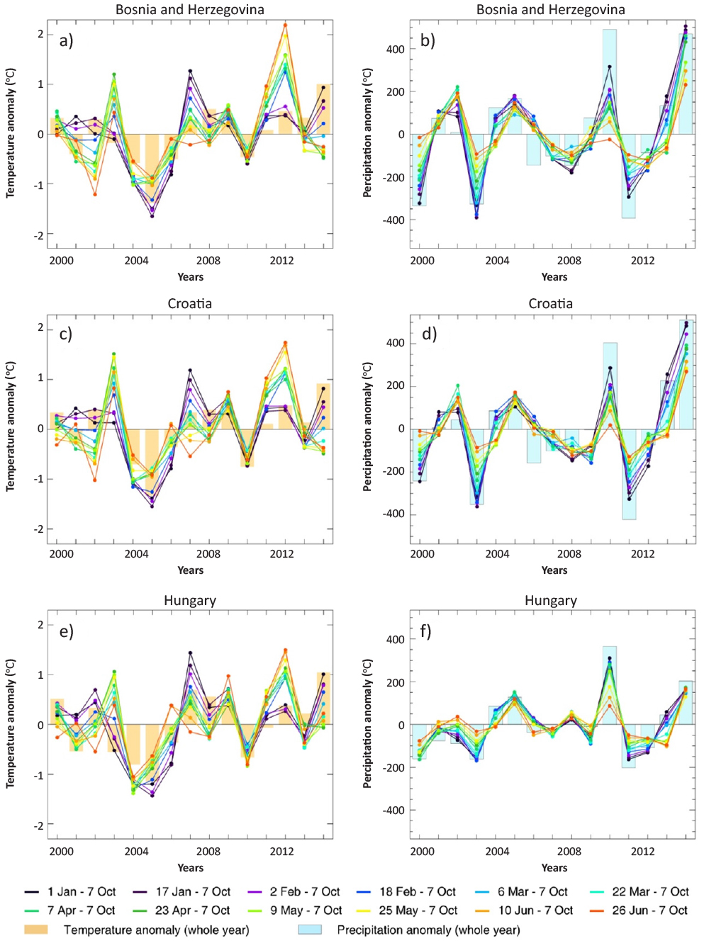 FIGURE 10. Temperature (left side images) and precipitation (right side images) anomalies of time periods with different length within the years during 2000-2014 based on the FORESEE database for Bosnia and Herzegovina, Croatia and Hungary (curves represent the selected time periods ending in 7th October, while columns indicate anomalies for the entire year).