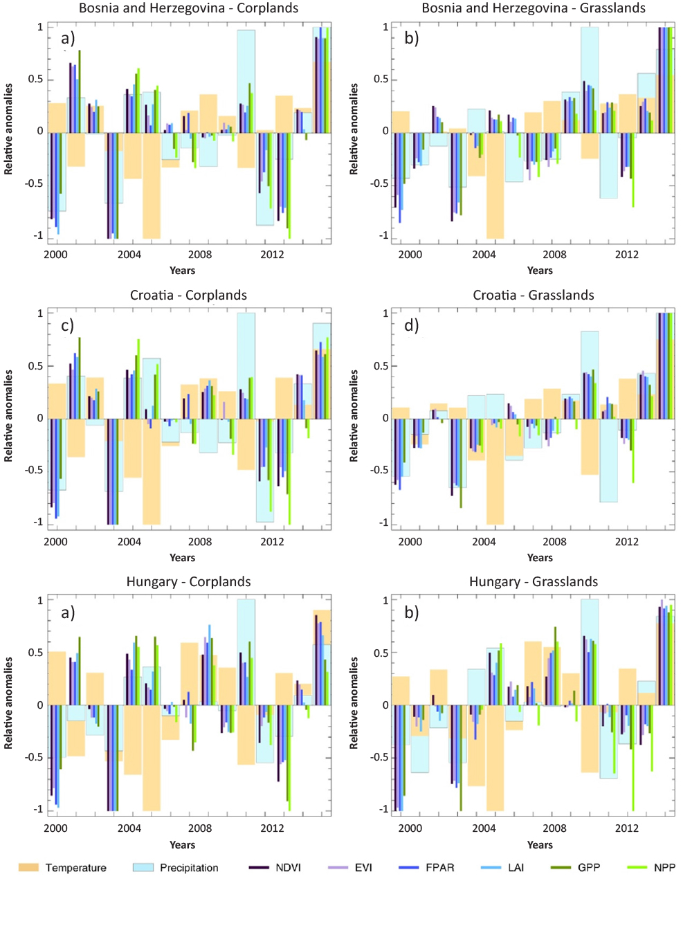 FIGURE 11. Yearly relative anomalies of the vegetation related characteristics (such as NDVI, EVI, FPAR, LAI, GPP and NPP) and of the meteorological variables (temperature and precipitation) during 2000-2014 for croplands and grasslands of Bosnia and Herzegovina, Croatia and Hungary.