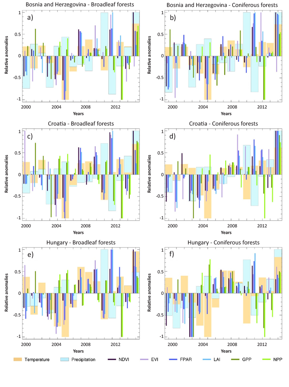 FIGURE 12. Yearly relative anomalies of the vegetation related characteristics (such as NDVI, EVI, FPAR, LAI, GPP and NPP) and of the meteorological variables (temperature and precipitation) during 2000-2014 for broadleaf and coniferous forests of Bosnia and Herzegovina, Croatia and Hungary.