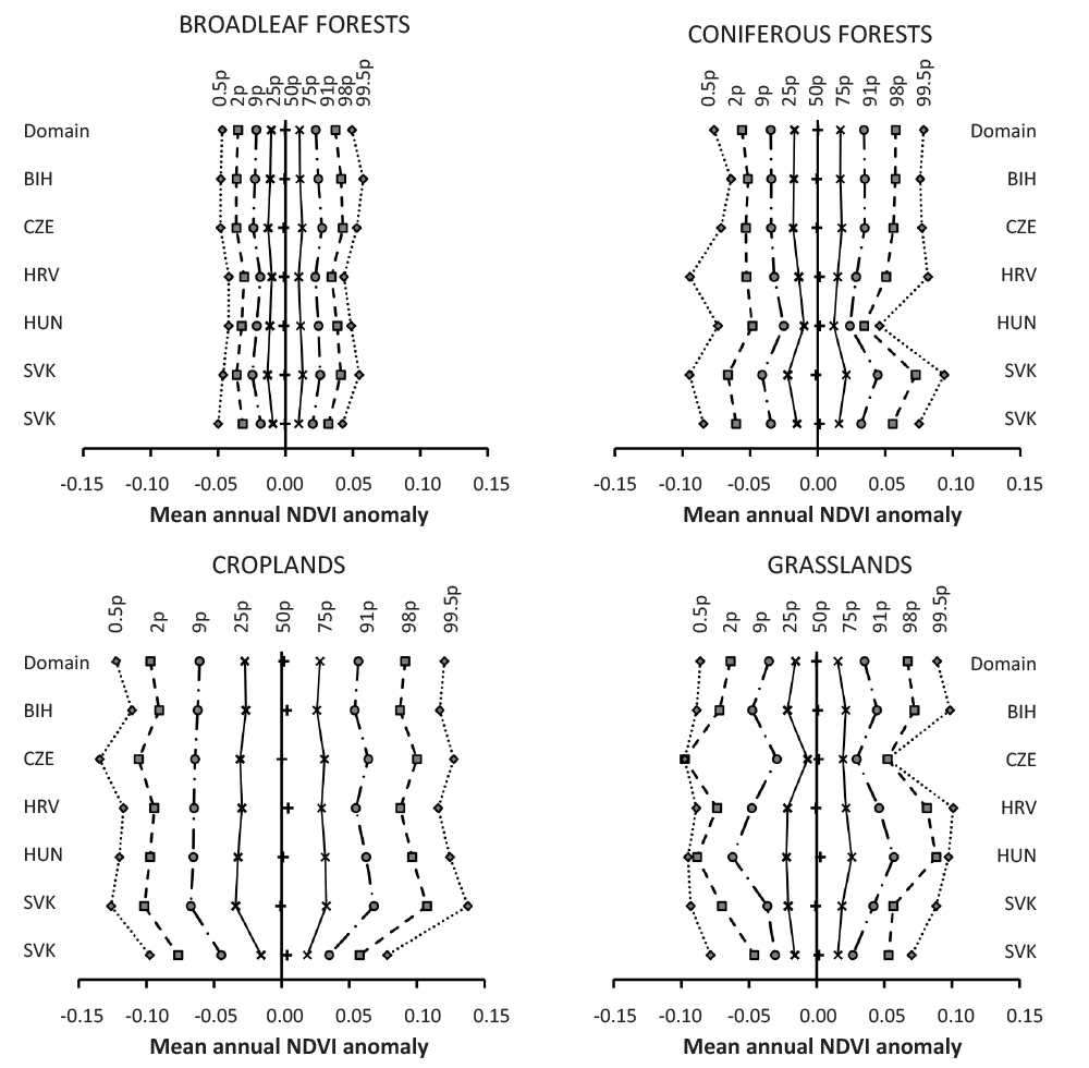 FIGURE 13. Categorization of mean annual NDVI anomalies according to the land cover for the selected countries and for the whole FORESEE domain (numbers at the top are percentiles (p; left of 0.5p - most extreme negative anomaly; 0.5p - 2p - extremely negative anomaly; 2p - 9p - very negative anomaly; 9p - 25p - negative anomaly; 25p - 75p - normal range; 50p - median; 75p - 91p positive anomaly; 91p - 98p very positive anomaly; 98p-99.5p extremely positive anomaly normal; right of 99.5p - most extreme positive anomaly); BIH - Bosnia and Herzegovina, CZE - Czech Republic; HRV- Croatia; HUN - Hungary; SVK - Slovakia; SVN - Slovenia).