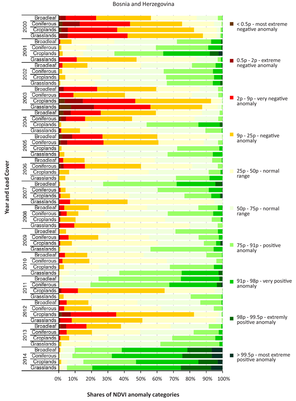 FIGURE 14. Distribution of shares of NDVI anomalies by categories according to the land cover and years for Bosnia and Herzegovina.
