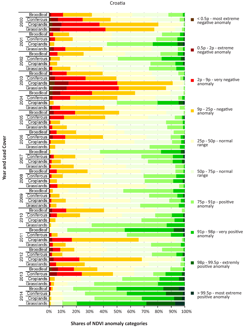 FIGURE 15. Distribution of shares of NDVI anomalies by categories according to the land cover and years for Croatia.