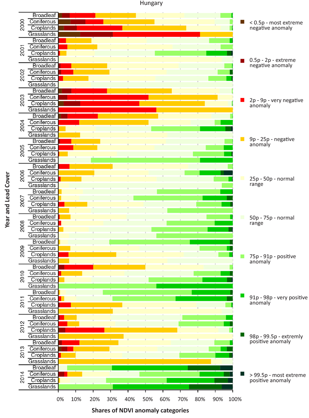 The derived percentile values are appropriate to des-cribe the total distribution of the anomaly values of a given land cover type (within a given country) during the study period of 2000-2014. Based on the proposed categorization we calculated for every year separately the number of the pixels (as the percentage for a given LC type) within all the created percentile ranges. Note that there might be situations when e.g. strong positive anomaly was not occurring in the entire time period for a given LC type at all. In this study the maximum anomaly is used independent of its magnitude.