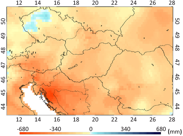 In order to study the dependence of the strength of meteorological anomalies on the selected integration time period, first we present country averaged mean temperature and precipitation anomalies in Figure 10 (left and right side images, respectively) during 2000-2014 for Bosnia and Herzegovina, Croatia and Hungary (and in Figure S1 in the Supplementary Material for Czech Republic, Slovakia and Slovenia).