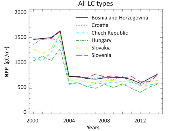 FIGURE 7. Country-averaged annual mean MODIS NPP values for the investigated countries in Central Europe (note that due to technical issues the first 4 years (2000-2003) are not applicable for further processing).