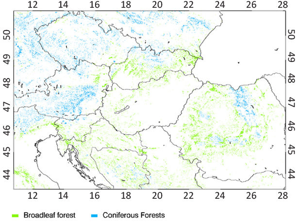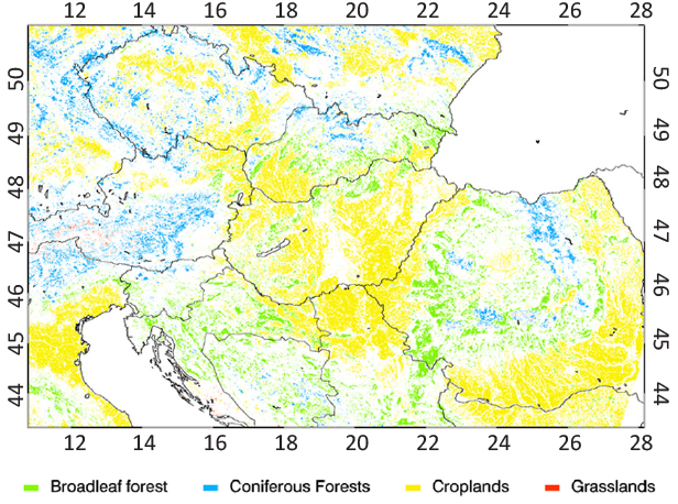 From the five types of land cover classification contained in the MCD12Q1 product [31] we used the Type-1 (International Geosphere Biosphere Programme - IGBP) to identify croplands and grasslands and the Type-3 (MODIS-derived LAI/fPAR scheme) classifications for broadleaf and coniferous forests. The categories of the land cover classification for the used MODIS pixels are given in the translation matrix between the different LC schemes (Table 2). The reason behind the usage of Type-3 for forests was that the widely used Type-1 IGBP land cover classification suffers from well-documented errors [32, 33] with 75% overall accuracy [31] including misclassification of the mixed forest types as well [34]. We found that the misclassification is especially evident for the lowland forests along rivers, for example like the Gemenc forest by the Danube in Hungary, or the river Spačva basin in eastern Croatia, extending also to Vojvodina in Serbia. According to MODIS Type-1 land cover classification both forests have been categorized as mixed forest, while they are broadleaf forests in reality. In fact Spačva forest with its area of 40 kHa size is the largest complex of pedunculate oak forest in Europe [35]. In contrast to this, the Type-3 classification doesn’t have mixed forests category, resulting in all forested pixels categorized as either broadleaf or coniferous category. We have to note that in Type‑3 classification croplands and grasslands are categorized together as “Grasses/Cereal crops”, therefore Type-3 classification cannot be used to discriminate croplands and grasslands.
