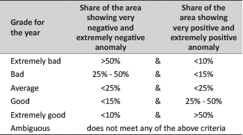 In this paper we propose the following classification of the years, which is based on the percentage of the area showing positive and negative anomalies of a given vegetation characteristics (NDVI, EVI, FPAR, LAI, GPP, and NPP). Using the yearly anomaly fields of given vegetation characteristic, for a specific land cover type, the chosen year can be graded based on the thresholds presented in Table 1. It should be noted that the grade for a given year at a given location depends on the selected reference period (e.g. MODIS era, in our case 2000-2014) and the area representing a domain (e.g. region, country or a continent).