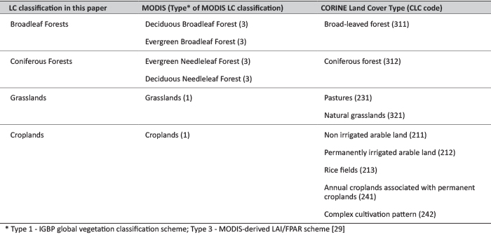 In order to increase the reliability of the applied LC categorization we used the CORINE land cover dataset as a reference LC dataset for the year 2012. The accuracy of CORINE is 87.0 ± 0.7% [21], which is significantly better than the 75% accuracy of MODIS [31]. Using GIS software [QGIS 2.16], we intersected the vector-based CORINE layer with the grid of the MODIS pixels at 500 m × 500 m spatial resolution and obtained the share of every of the 44 CORINE land cover types present within each of the MODIS grid-cells (i.e. pixel). Due to differences in land cover categorization between MODIS and CORINE, we used translation matrix (Table 2) to unify the classification. Based on the area share information of CORINE we selected so called CLC2012 pure pixels for deciduous forests, coniferous forests, croplands and grasslands, which contained at least 90% area share from the given LC type (Table 2, column 1). In the case of croplands and grasslands the 90% threshold was applied for the sum of the area shares of the different CLC categories (separately for croplands and grasslands) listed in Table 2 (column 3).
