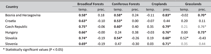 TABLE 4. Correlation coefficients (r) between the yearly NDVI and meteorological (temperature and precipitation) anomalies for the main land cover type in the case of the different countries (note, for Czech Republic and Slovenia the number of the selected grassland pixels were less than 5 (Table 2)).