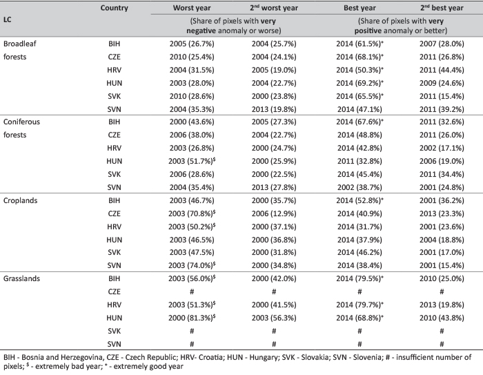 Regarding the negative extreme in the case of forests, the situation is more complex. Unlike for croplands and grasslands, year 2003 was not the worst in all cases except for broadleaf forests in Hungary and coniferous forests in Hungary and Croatia. Interestingly, year 2004 and 2005 are indicated as worst or second worst years for forests in different countries. This could imply that the negative effects of year 2003 (which was in fact an extremely warm and dry year all over Europe [39] on forest ecosystems were not immediately visible, but the consequences of the unfavourable weather was “remembered” by the ecosystem and manifested itself in the following years. This “dampening” effect of the negative anomalies in the case of forests is very important. It shows how difficult is to make straightforward conclusions based only on the current observation without taking into account the events of the past.