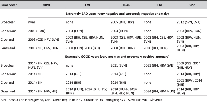 Table 6 shows the summary of country-specific extreme years for the different land cover types and different vegetation indices (based on the approach given in Table 1). Note that NPP is not used here due to problems with the temporal coverage of the dataset (see Section 2.3). The table shows that for herbaceous vegetation and for coniferous forests in Central Europe year 2003 is undoubtedly the most important year that affected vegetation status adversely. Besides year 2003, year 2000 is also notable. Meteorological conditions during those years need deeper evaluation. In contrast, for broadleaf forests year 2005 and 2012 might be notable, but as it was mentioned earlier, there is no clear evidence for unanimous selection of extremely unfavourable year in terms of overall forest development status. Considering above-average plant performance year 2014 is clearly noticeable for herbaceous vegetation and coniferous forests (to a lesser extent). For broadleaf forests the situation is similar to the bad year case, namely there is no unambiguous single good year. 2009, 2011 and 2014 might be studied in some countries to gain deeper understanding of the cause of the positive anomalies. The presented results corroborate that the different vegetation characteristics provide relatively consistent results in terms of anomalous plant behaviour.