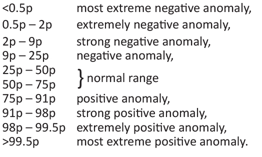 To analyse the spatial distribution of the yearly anomaly fields, we calculated the 0.5, 2, 9, 25, 50, 75, 91, 98 and 99.5 percentiles values of all yearly mean anomaly values for all land cover specific pixels separately within a given country. The selected percentiles define thresholds for the classification of anomalies into the following 10 categories: