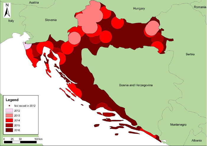 Data about the occurrence of BTM in Croatia were obtained by field observation conducted by the authors of this study and by the data obtained from professional nursery growers, other professionals working with plants and the general public (enquiries via the web portal Štetnici Hr and personal enquiries via phone and e-mail) in the years 2013, 2014, 2015 and 2016. For each location where BTM larvae and damages were found and reported, the name of the location, geographic coordinates and the year of the first damages were recorded. Whenever possible, photographic material was requested from the general public to minimise false identification.