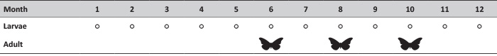 TABLE 1. Field observations of the development of box tree moth (Cydalima perspectalis) in 2014. The presence of larvae on plants is shown in table as circles, and the presence of adults is shown as a butterfly symbol.