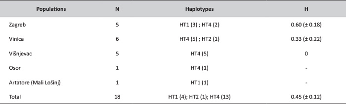 TABLE 2. The list of samples of C. perspectalis from Croatia and haplotype distribution per population (N = Number of individuals per population, H = Haplotype diversity).