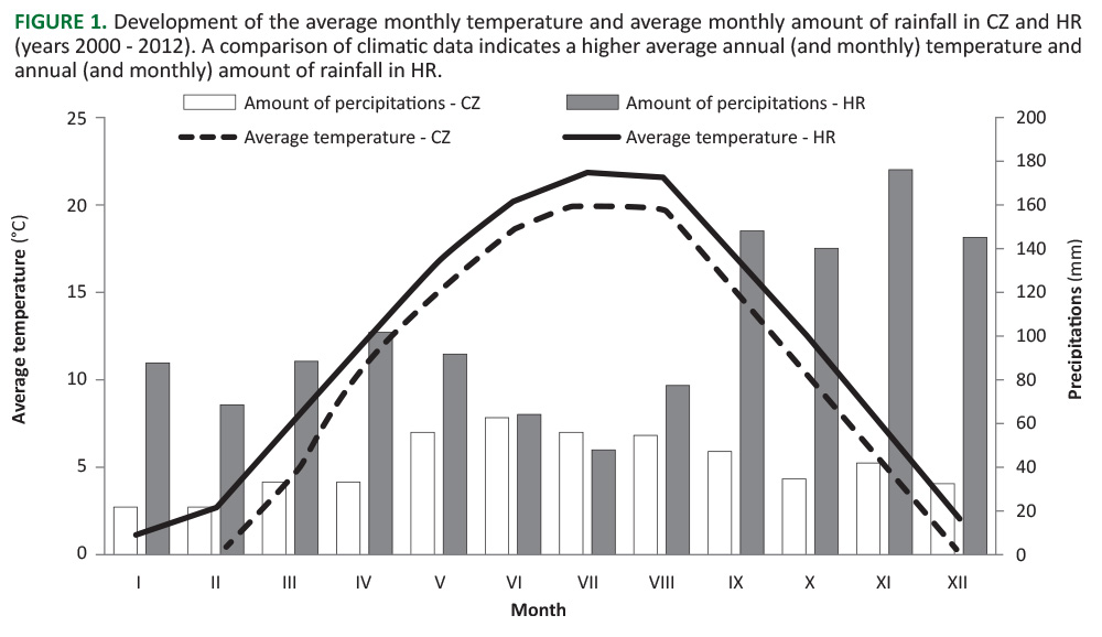 In CZ, specifically in the South Moravian region (Židlochovice), the research was conducted in floodplain forests (managed by the State), located along the Morava, Dyje, Svratka and Jihlava rivers. The predominating soil type, cambic fluvisol, was slightly gleyic, eubasic in double substrates with chernozem fossils (ca. from 160 cm) on fluvial Holocene sediments. In HR, the research was conducted in the floodplain forests of pedunculate oak within the area of the Sava River. Research encompassed the management unit of “Opeke” (managed by the Faculty of Forestry of the University of Zagreb). The dominant soils included pseudogley level terrains, deep, illimerised brown soil, pseudogleyic, and eugley epigleyic (in micro depressions). A comparison of long-term and short-term HR and CZ climatic data (Table 1, Figure 1) indicates a higher average annual (and monthly) temperature and annual (and monthly) amount of rainfall in HR.