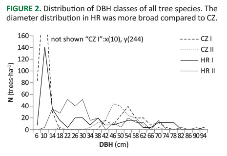 In contrast, the analysis of stand structure confirmed the expected differences between these two countries. While in CZ the poor structure and the tree characteristics observed are given by the clear-cutting management model, the more diverse structure of the forest in HR corresponds to the Croatian model with a multi-layered floodplain forests [12]. Such a model is also closer to the natural conditions in virgin floodplain forests, where the relatively dynamic structure is characterised by a multi-layer distribution of tree species and a distinct diameter differentiation, which particularly applies to the optimum stage [7, 8, 21].