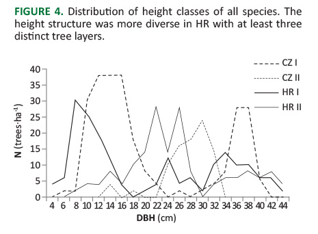 Similarly, the height structure was more diverse in HR with at least three distinct tree layers formed, the heights being about 10 m, 24 m, and 36 m (Figure 4). In CZ I, only two layers were formed (around 14 m and 36 m) and in CZ II only a single layer was formed (ca. 30 m).