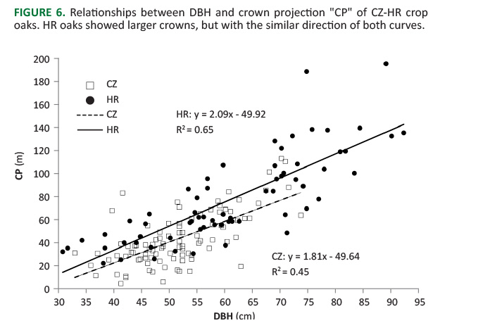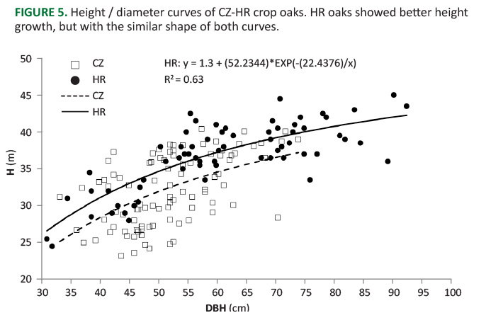 The growth relationships of CZ-HR oaks showed a similar trend (or shape of constructed curves). Thus, the stem and crown characteristics (and also the amount and quality of produced acorns) of new CZ oaks could be probably changed if changing silvicultural system. However, based on the results presented in this paper we can not determine exactly which concrete factor caused the observed differences between HR and CZ. Probably there exists a complex of various factors such as climate, water regime, tree vitality and physiological stress, genetic predispositions, etc. This study should be a start and a challenge for future cooperation and long-term research in this field.