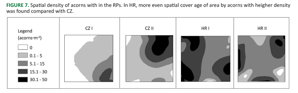 The statistical differences between the RPs in terms of tree or acorn characteristics were tested using the non-parametric Kruskal-Wallis one-way analysis of variance (using Statistica 10 - StatSoft, Inc., USA). The spatial pattern of acorns (see Figure 7) in 5 categories of density (0; 0.1-5; 5.1-15; 15.1-30; 30.1-50 acorns per m2) was estimated on each RP using ArcGis 10 with Kernel statistics (interpolation) tool (Esri, Inc., USA). This analysis was a basis for deriving the share of area covered by acorns and the share of crop oaks belonging to different categories of acorn density (see Table 10).