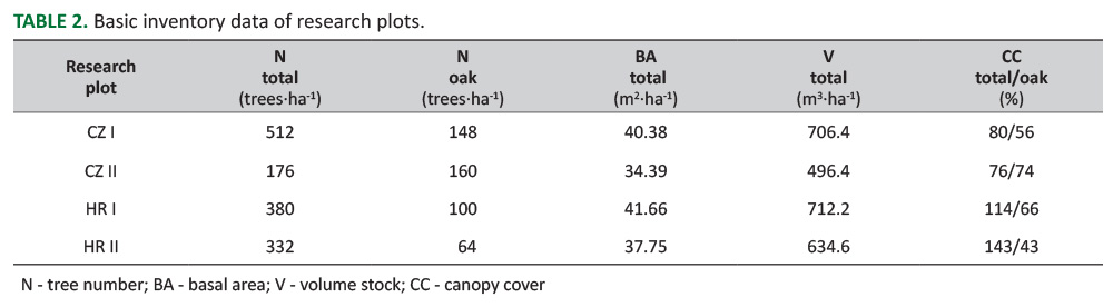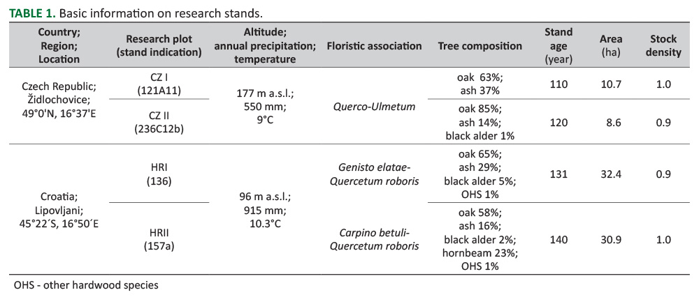 In each country (Czech Republic “CZ”, Republic of Croatia “HR”) in the year 2013, two managed adult floodplain forest stands before regeneration felling that represented a typical species and spatial structure of that experimetal region were selected (Table 1). The selected stands in CZ and HR differed primarily in species composition (CZI - oak and ash, CZII - oak, HRI - oak and ash, HRII - oak, ash and hornbeam).