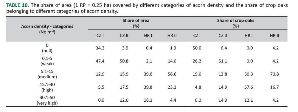 The share of covered area by acorns was higher in HR (about 80% of the total area covered by medium or high density of acorns) compared with CZ (about 50-80% of the total area covered by null or low density of acorns) (Table 10). In HR medium or high acorn density / seedfall was observed in 80% of all oak trees, while in CZ null or weak seedfall was observed in 50-80% of all oaks (Table10).