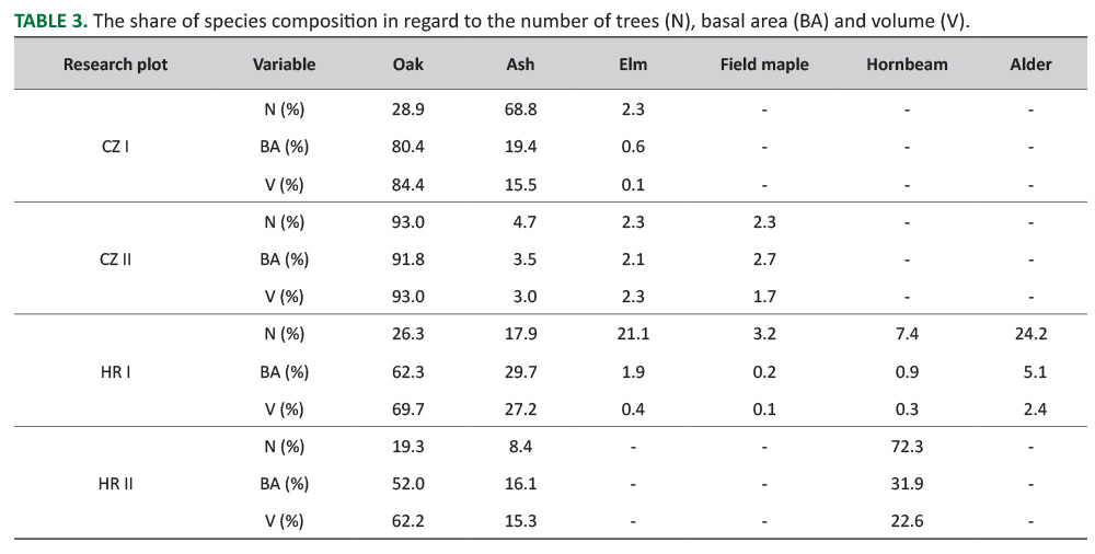 Results: Despite the different natural and management practices, the total standing volume of floodplain forest was found to be similar in both countries, ranging from 500 to 700 m3·ha-1 (basal area: 34-41 m2·ha-1). In CZ generally more poor structure diversity was detected. Although in CZ the number of crop oaks (130-160 oaks per hectare) was almost double as compared with HR, the CZ oaks had shorter crowns, almost twice smaller crown projection, lower mean volume and lower share of valuable assortments.