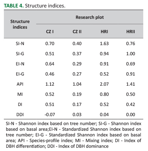 The most diverse species structure in HR was found for HR I (a total of six species), while in the CZ hornbeam and alder were absent in all cases. A more diverse species structure (even the vertical profile) in HR was confirmed also by the structure indices (SI, EI, API, MI) (Table 4).