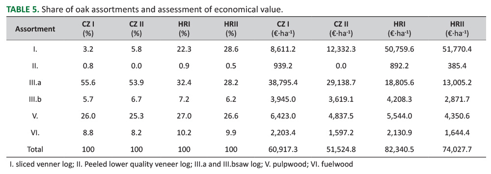 TABLE 5. Share of oak assortments and assessment of economical value.