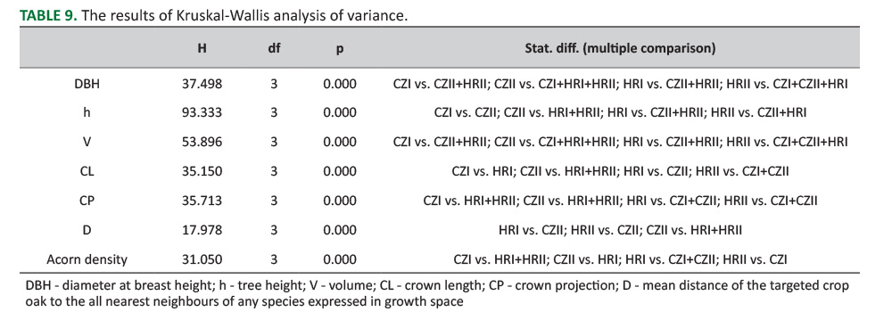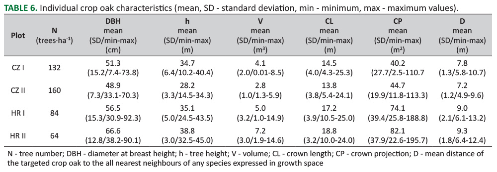 HR was found to contain less crop oaks compared with CZ (Table 6). In general crop oaks in HR reached higher mean DBH and V (Table 6); however, significantly only when CZ I was compared with HR II and CZ II with HR I and HR II (Table 9). Tree heights were similar, except for CZ II. Crop oak crown characteristics, i.e. CL and CP, were significantly greater in HR (except for CL of CZI when compared with HRI); the mean CP here being almost twice as large as those in CZ (Table 6 and 9). Mean distance (D) of the targeted crop oak to the nearest neighbours was greater in HR (significantly only when CZ II was compared with HR I and II) (Table 6 and 9). These results confirmed also the growth relationships (DBH vs. h vs. CP) of CZ-HR oak trees with the similar direction and shape of constructed curves (Figure 5 and 6).