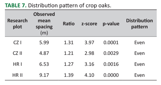 In both countries, oaks showed the same significant and even distribution across the plot with spacing (i.e. the distance to the nearest neighbouring oak) being greater for HR (Table 7).