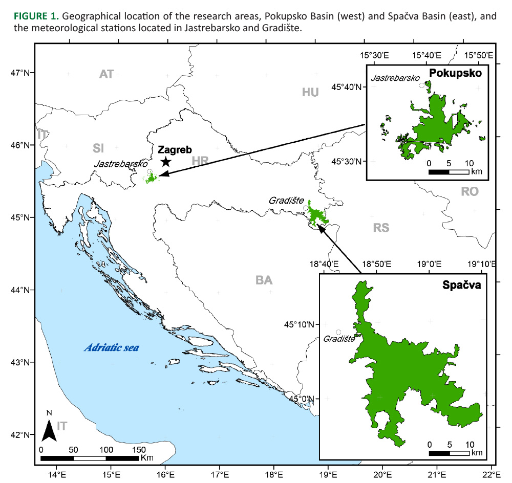 The research was conducted in two distinct areas of managed pedunculate oak forest in Croatia, Kupa River Basin (also called Pokupsko Basin) located in western part of Croatia, approximately 35 km SW of Zagreb, and Spačva Basin located in eastern part of Croatia, approximately 35 km SE of Vinkovci (Figure 1).