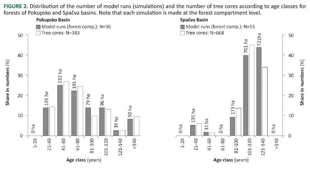 In this research, we simulated the productivity of selected stands in managed oak forests in two selected areas, Pokupsko Basin (4 forest management units with 947 forest compartments covering 11.1 kha in total) and Spačva Basin (13 forest management units with a total of 2918 forest compartments covering 47.8 kha in total). Only forest compartments categorised, according to the dominant tree species, in forest management plans as management class of pedunculate oak, older than 15 years in the year 2000, and for which regeneration harvests have not occurred between 2000 and 2014 were considered for simulation and tree coring (potentially 6.4 kha in 524 compartments in Pokupsko and 33.2 kha in 2083 compartments in Spačva Basin). For the selected 2607 forest compartments in both areas, we run the simulations. However, in the comparison of modelled and measured results only those forest compartments where we actually performed measurements were considered (36 in Pokupsko and 55 in Spačva Basin). More details on the selection of forest compartments are given in the next chapter.