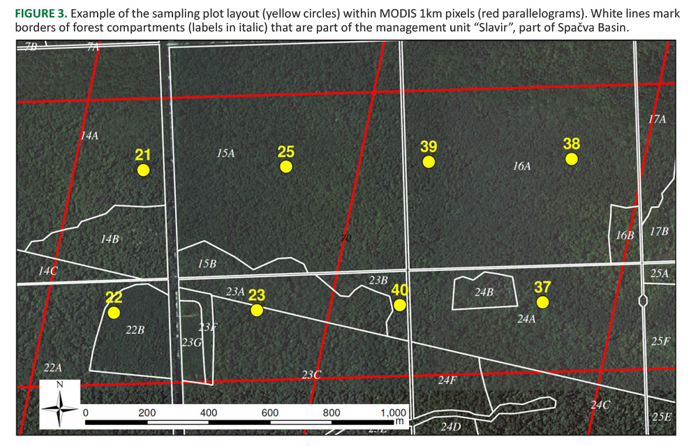 A field survey was conducted from spring 2015 to spring 2016. This research was part of the project EFFEctivity (http://www.sumins.hr/en/projekti/effectivity/) which had, in addition to the work presented here, also the goal of testing MODIS MOD17 annual Net Primary Productivity product [39]. This determined the design for the selection of the plot locations. In short, both forest areas, Pokupsko and Spačva, were overlaid with grid corresponding to MODIS 1 km resolution pixels. Only pixels with more than 90% forest cover and with homogenous age structure (forest compartments consisting of >70% of the pixel area had to have the stand age difference of less than 40 years) were selected and in each pixel four plots were installed. The location of the plot was at the centre of the MODIS pixels with 500 m resolution (each 1 km MODIS pixel can be subdivided into four 500 m pixels). The example of the plot layout is presented in Figure 3. In total, 109 temporary circular plots were placed within two investigated forest areas (41 plots in Pokupsko and 68 in Spačva). Sampling radius varied depending on the stand age and tree size of the sampled tree with larger trees being sampled using larger radius [40] (Table 3). On each plot diameter at breast height (dbh, 1.30 m above the ground) of all sampled trees, as well as tree location on the plot (i.e. distance from the plot centre and azimuth) were recorded.