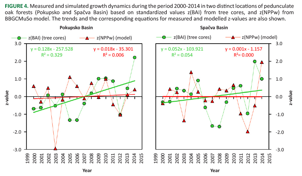 Materials and Methods: In our research, we used tree-ring data as a ground truth to test the performance of Biome-BGCMuSo (BBGCMuSo) model in two distinct pedunculate oak forest areas, Kupa River Basin (called Pokupsko Basin) and Spačva River Basin, corresponding to a wetter and a drier site, respectively. Comparison of growth estimates from two different data sources was performed by estimating the dynamics of standardized basal area increment (BAI) from tree-ring data and standardized net primary productivity of stem wood (NPPw) from BBGCMuSo model. The estimated growth dynamics during 2000-2014 were discussed regarding the site-specific conditions and the observed meteorology.