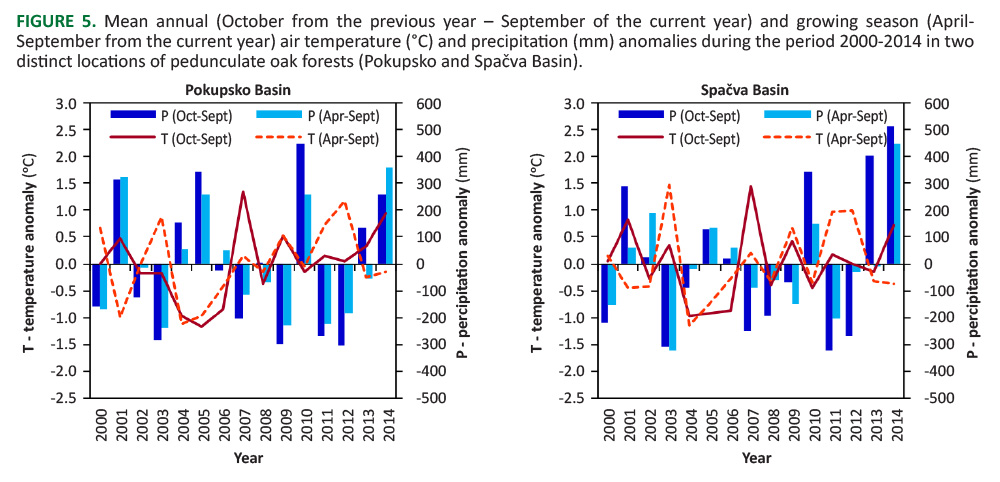 Meteorological data were analysed for the same period as for growth dynamics, from 2000 to 2014. For each location mean annual (October-September) and seasonal (April‑September) air temperature (°C) and precipitation (mm) anomalies were calculated as follows: