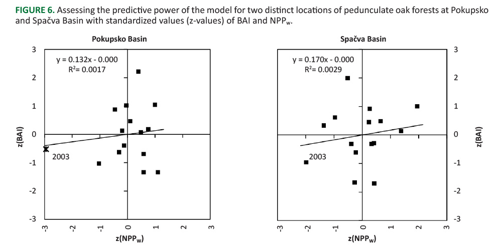 Before performing standardization, a Shapiro-Wilk W test for normality was conducted on a series of average annual tree BAI and average annual NPPw estimates for each forest area using procedure swilk in STATA 14 (StataCorp, College Station, TX, USA). Average annual BAI data series were normally distributed (W=0.9791, p=0.9630 for Pokupsko; W=0.9559, p=0.6224 for Spačva). Similarly, average NPPw data series were also normally distributed (W=0.9532, p=0.5756 for Pokupsko; W=0.9699, p=0.8563 for Spačva). Therefore, standardization of the data sets is allowed.