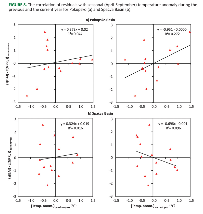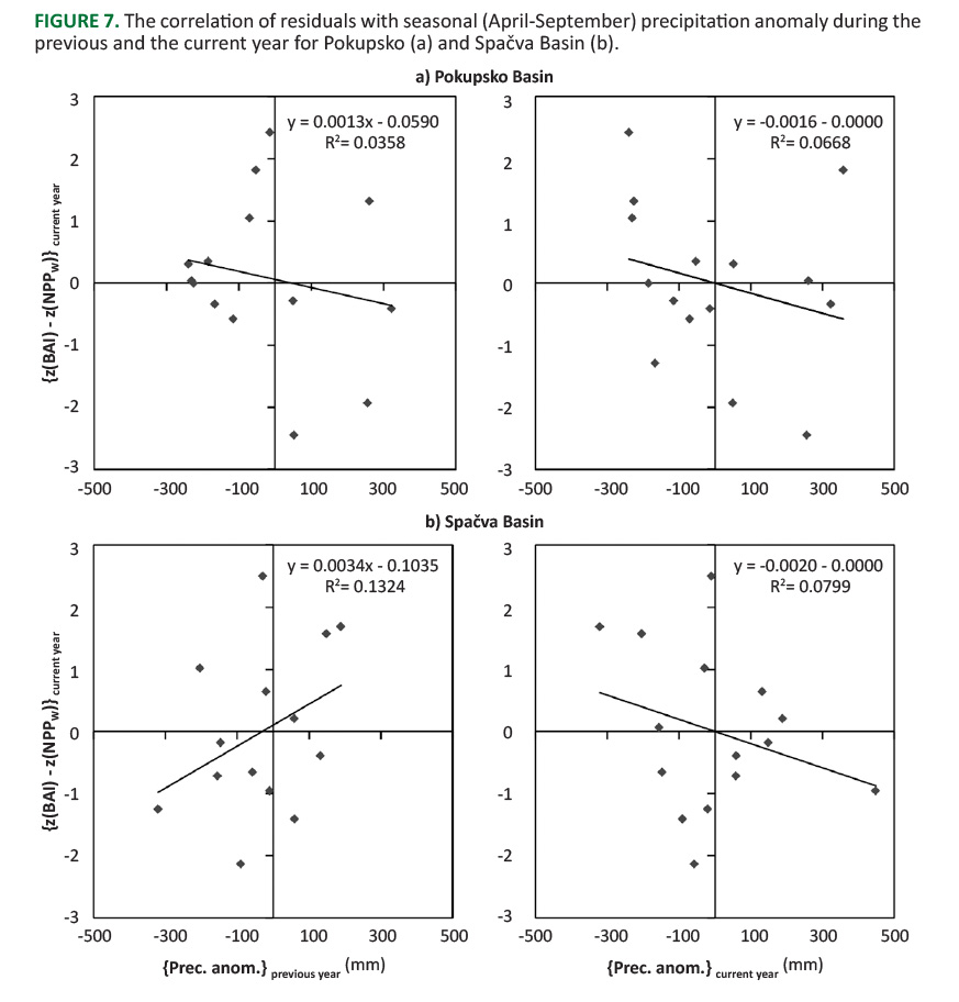 Residual analysis was performed to find possible sources of model-data discrepancy. According to Figures 7 and 8, the relationship between the studied meteorological variables (data from the previous year and the current year) and the model residuals was not significant for the two study sites. However, the trends, although not statistically significant, might be indicative. Positive/negative precipitation (Figure 7) anomaly in the current year seems to cause over/underestimation of NPPw at both sites, although data variability is high. This means that the role of water availability is more emphasized in the model than in reality. On the other hand, there is a difference between locations in the model performance for the current year with respect to the precipitation anomaly in the previous year (Figure 7). At the wetter (Pokupsko) location negative precipitation anomaly still seems to cause the underestimation of the NPPw by the model, but at the drier site (Spačva) the effect is reversed (negative precipitation anomaly seems to cause overestimation of NPPw by the model). Opposite to the effects of precipitation, positive/negative air temperature (Figure 8) anomaly in the current year seems to have different effects at each location. At the wetter (Pokupsko) location, positive temperature anomaly seems to cause underestimation of NPPw, while at the drier (Spačva) site it causes overestimation. Interestingly, positive air temperature anomaly in the previous year seems to cause underestimation of NPPw at both locations. The observed relations are not statistically significant, as we already emphasized, but are in accordance with the logic of buffered growth response against single drought events due to a large rooting depth of trees.