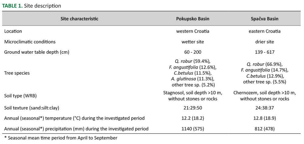 The forest complex of Spačva Basin lays at the most eastern part of Croatia, between Sava and Drava rivers, on the catchment area of Bosut River and its tributaries. Located between 18°45’ and 19°10’ longitude east and 44°51’ to 45°09’ latitude north, it occupies flat-curly basin of altitude ranging from 77 to 90 m a.s.l., which is intersected by numerous small rivers. According to Seletković [20], the climate in the eastern part of pedunculate oak distribution area in Croatia is warm temperate with maximum rainfall in June, without exceptionally dry months in summer, and with driest months occurring during cold period of the year. The mean annual air temperature is 11.5°C and precipitation is 686 mm·y-1 for the period 1981-2010 (data obtained from National Meteorological and Hydrological Service for nearest meteorological station Gradište, 45°10’N, 18°42’E, 89 m a.s.l., approx. located 4 km W of the Spačva forest). Majority of Spačva Basin forest soils are semi-terrestrial or hydromorphic soils on loamy-clay river sediments [21], and according to World Reference Base for Soil Resources [18], they are classified as chernozem. In the period from 1996 to 2012, an average observed groundwater table depth was ranging from 139 to 617 cm [22]. Differences between two forest complexes are summarized in Table 1.