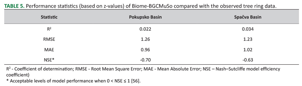 The comparison of modelling results with the observed tree-ring data revealed two important model issues related to its predictive power. The first one is the importance of including site-specific conditions (i.e. groundwater table information) with the purpose of enabling the model to be more case-sensitive. At both oak forest locations, Pokupsko and Spačva basins, BBGCMuSo showed poor predictive power in capturing the dynamics obtained from tree‑ring data. Using groundwater table information for modelling in lowland oak forests might improve model results.